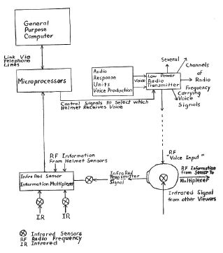 In the DECOY the input is in the form of the viewer's 'history of observation' coupled with additional information given to the sculpture's computer by a human assistant stationed within the room. This additional information would consist of various descriptors such as color of clothing, sex, physical features, helmet number, etc. The system will use this information to create various situations within the room. For example, what would you think, if suddenly everyone in the room looked at you? The reason for their stares could be the system's comment to everyone, that is, except you: "Look at that interesting cane the gentleman in the tan coat is holding." The people, their actions, and reactions are the sculpture, the physical sculpture in the room is only a decoy.