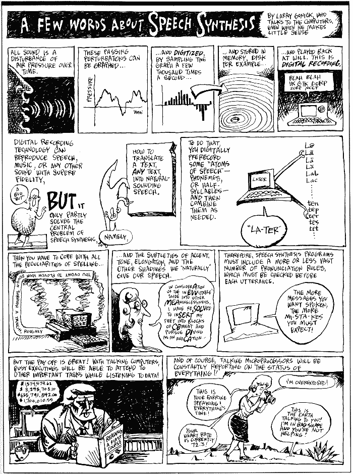 In the first place, while the variations in different words can be shown on scientists' detailed charts of frequency and amplitude, the words by themselves say nothing unless they have a syntactical order. Second, while human speech often rambles on, sometimes running words together and coming up with slang like "gonna" for "going to," sound alone is not enough to let the computer know where one word ends and another begins. Third, while we have an uncanny ability to understand what's said to us even in the midst of a rock concert, the computer is easily confused by noise.