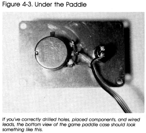 end. 2. Connect one end of two of the wires to pin 7 of the 9-pin plug. 3. Connect another two wires to pin 8 of the plug. 4. Solder the remaining four wires to pins 3, 4, 5, and 9. 5. Remove the cover from one of the plastic boxes and drill two holes as in Figure 4-1. One hole is for the potentiometer, while the other is for the switch. Drill a hole in one end of the plastic case for the wires. Repeat these steps for the second plastic box. 6. Mount the switches and potentiometers in their respective holes. Attach the knobs to the shafts of the potentiometers. 7. Take one wire from pin 7, one wire from pin 8, the wire from pin 3, and the wire from pin 9 of the 9-pin plug to one of the paddle boxes. Pull the wires through the hole in the top end of the box. Turn the box cover with the potentiometer and switch mounted on it over so that their leads are facing up (as shown in Figure 4-1). 8. Connect the wire from pin 8 to one lead of the switch. Solder the wire from pin 3 to the other switch lead. The wire from pin 7 should be soldered to the left side lead of the potentiometer, and the wire from pin 9 is connected to the middle lead of the potentiometer. Mount the cover on the box. One paddle is completed. 9. The procedure for the second paddle is identical, except the wires are from pins 7, 8, 4, and 5 of the 9-pin plug. The wire from pin 8 connects to one lead of the switch. The other switch lead is connected to the wire from pin 4. The wire from pin 7 connects to the left lead of the potentiometer, and the remaining wire, from pin 5, connects to the middle lead. Close the plastic box, and your second paddle is finished. |